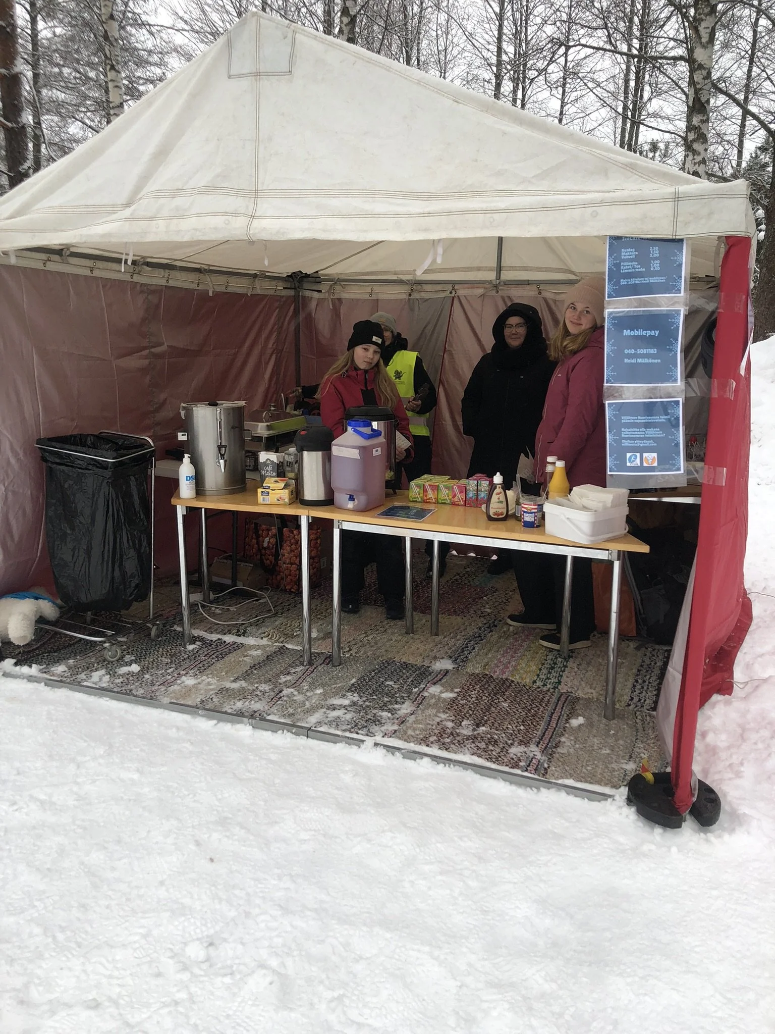 Buffet: Makkara, hotdog, herkkuja. Kahvia, teetä, mehua. Maksutapa: käteinen, pankkikortti, mobilepay.